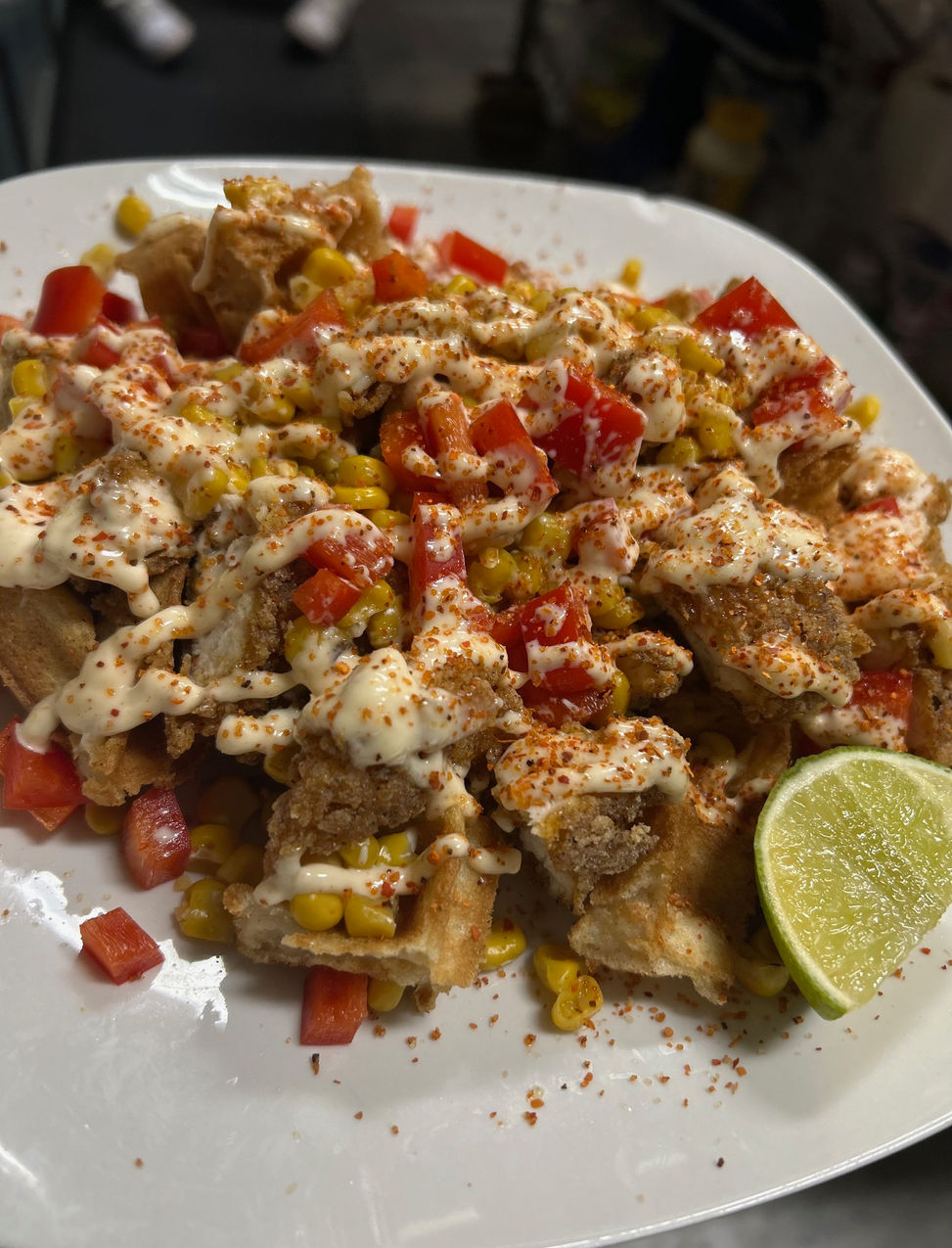 JUST IMAGINE...Belgian waffle + fried chicken + topping + drizzle = you're new go-to bowl